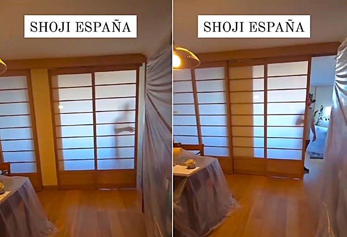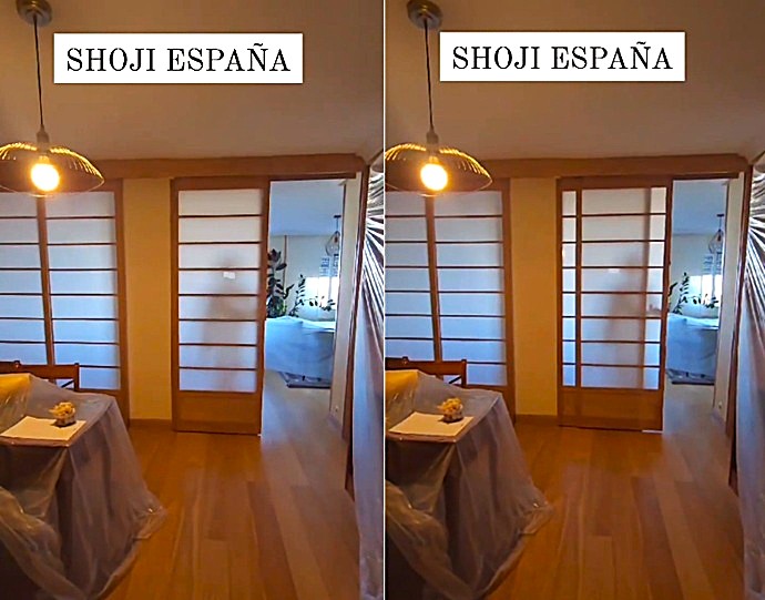 Proyecto en Arganzuela: instalación de puertas Shoji con sistema mixto. Apertura sincronizada para salón y acceso individual para dormitorio, optimizando luz y funcionalidad